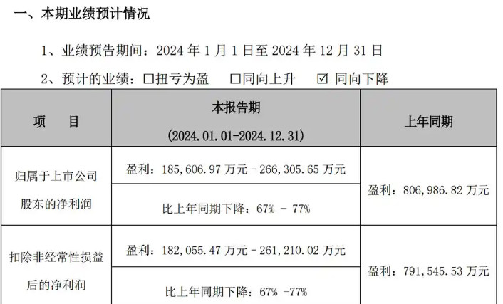 过去几年间,智飞生物因独家代理默沙东HPV疫苗而声名大噪,巅峰时期全年净利超过百亿元。然而,其日前发布的业绩预告显示,公司2024年归属净利润为18.56亿-26.63亿元,比上年度同期下降67%-77%。预计实现的扣非后净利润约为18.21亿-26.12亿元,比上年度同样下降67%-77%。